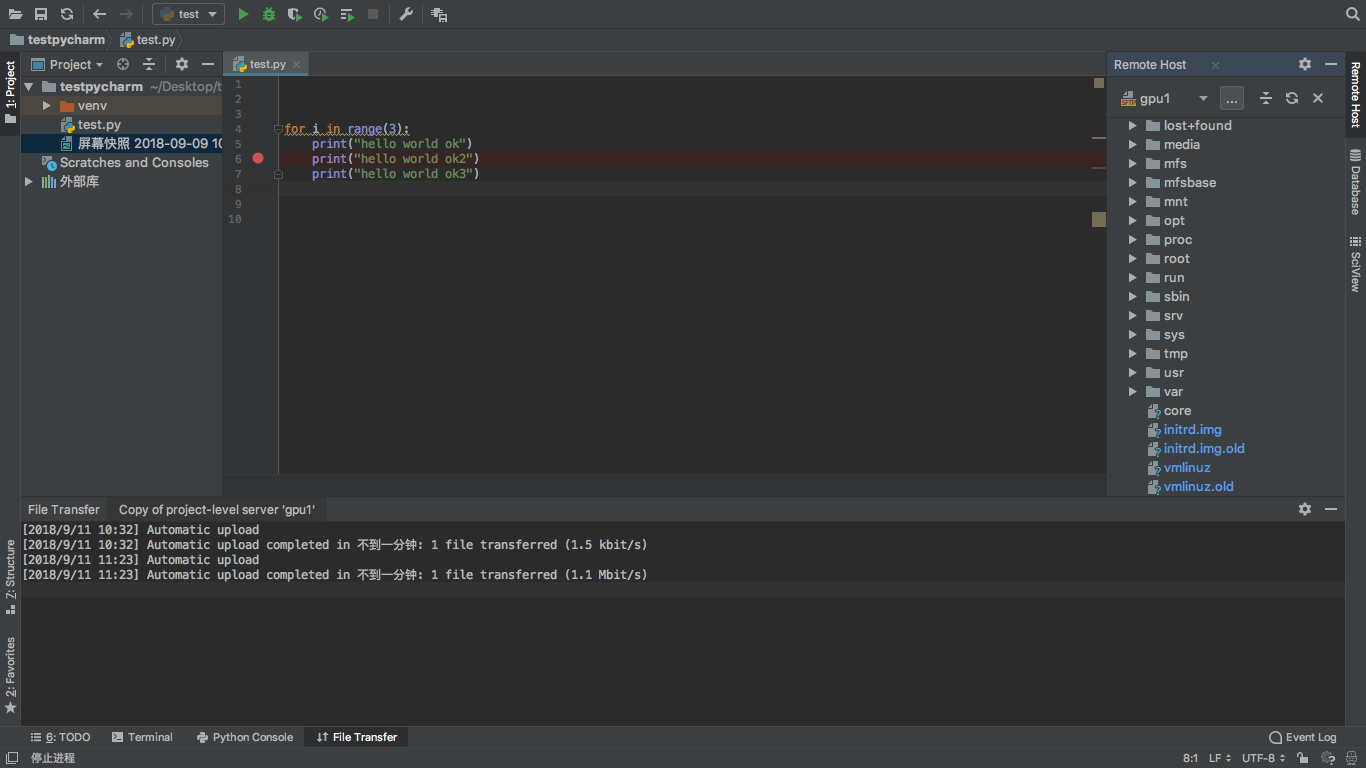 - 只需添加远侧解释器,同步远程项目文件夹,即可调用远程资源运行、debug本地代码,结果返回到pycharm中的下栏