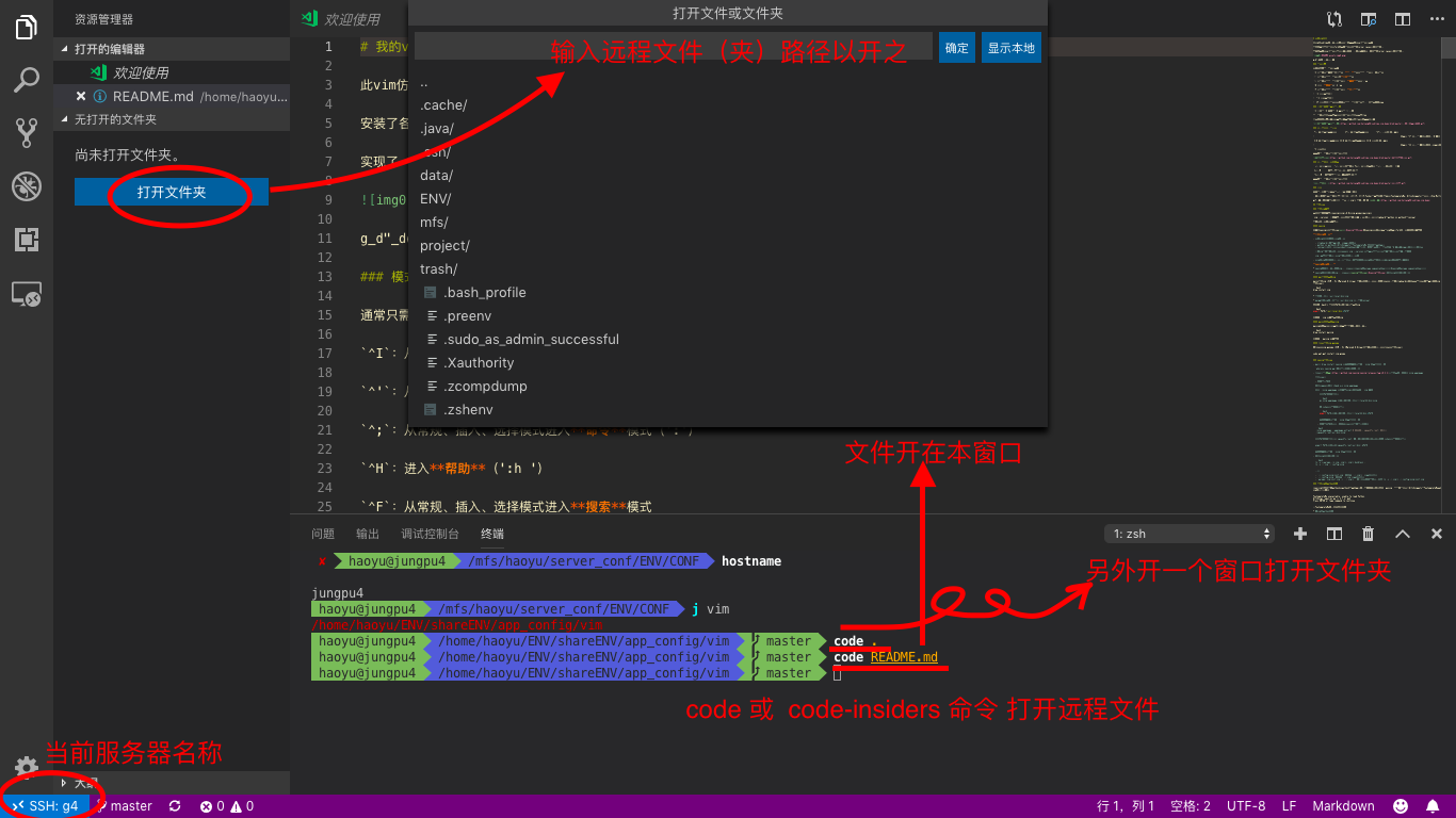 code(-insiders)命令打开远程文件(夹)。which code(-insiders) # 返回 # ~/.vscode-remote/bin/服务器的hash码/bin/code(-insiders)但远程开发, 在 本地外部终端 输入